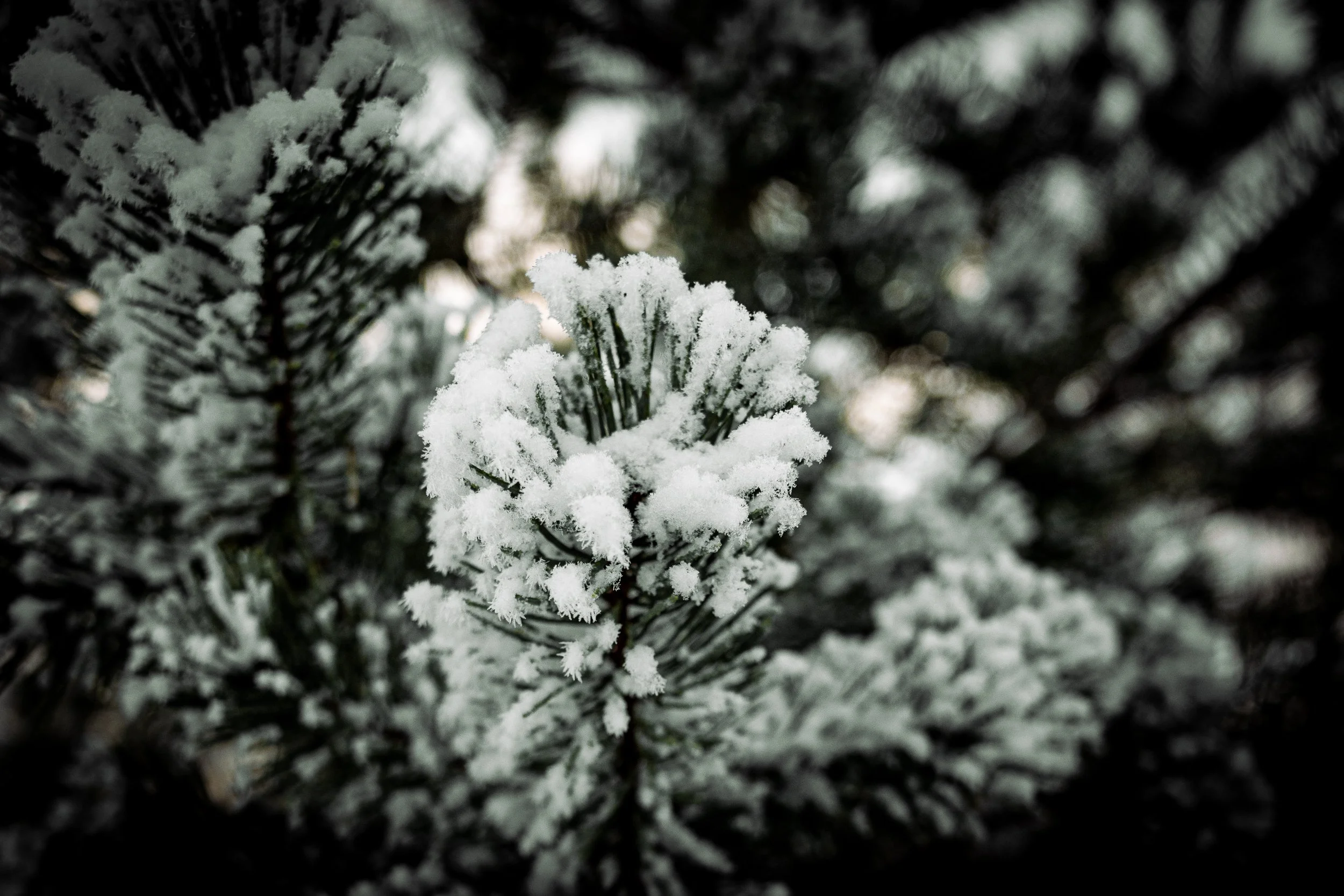 My simple intention was to look around with openness and curiosity—is there something here that speaks to me? This small question has become part of my personal ritual, a subtle shift into presence. I let the world reach me instead of searching for anything specific. And somewhere along the path, a small detail caught my eye: snow crystals gathered on a pine twig, illuminated by the cold light.